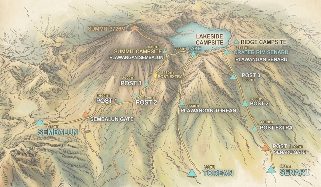 (C1 Sembalun稜線;C2 Senaru稜線) - 3天:Senaru入Sembalun出,雖然這個方向總爬升比較多,但兩晚營地都比較容易會有位置,最後一天攻頂完直接下山,是體力要求較高的部分