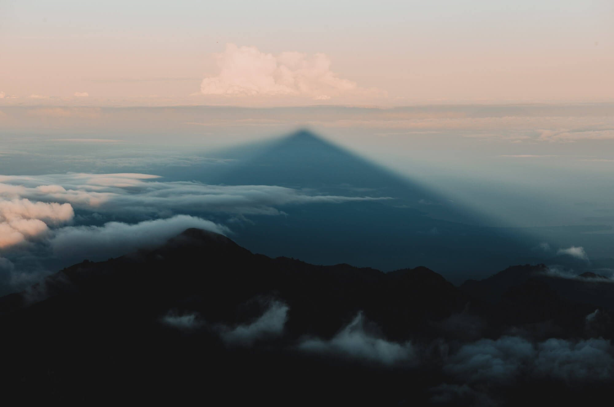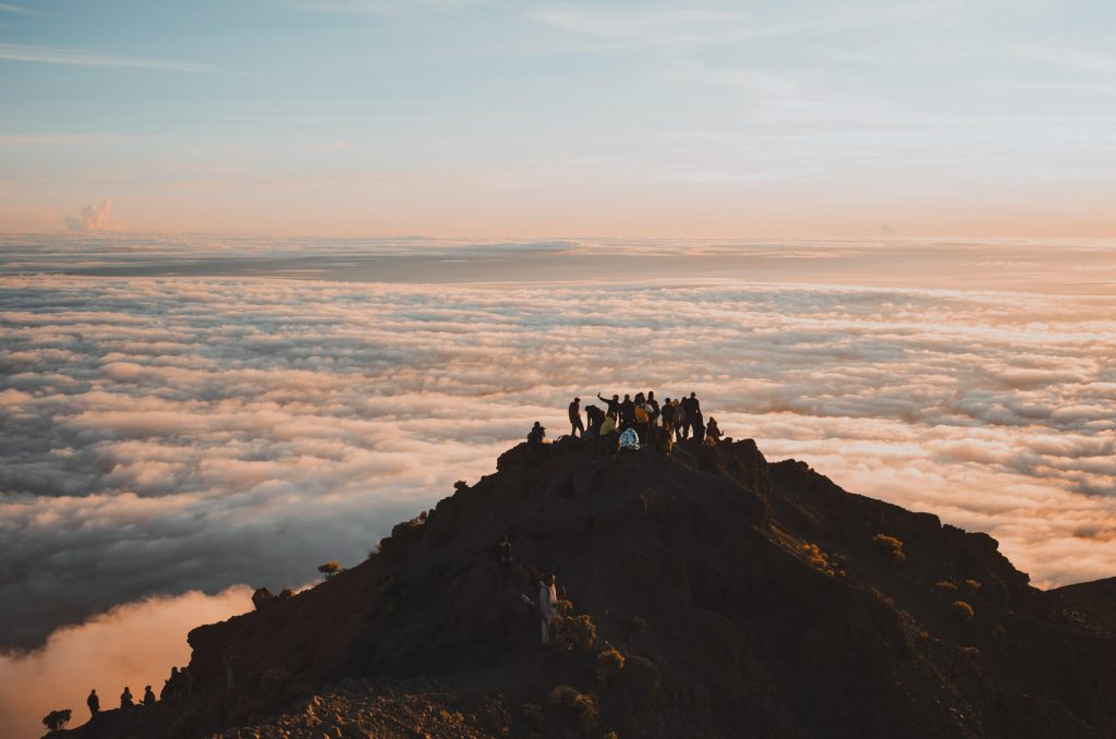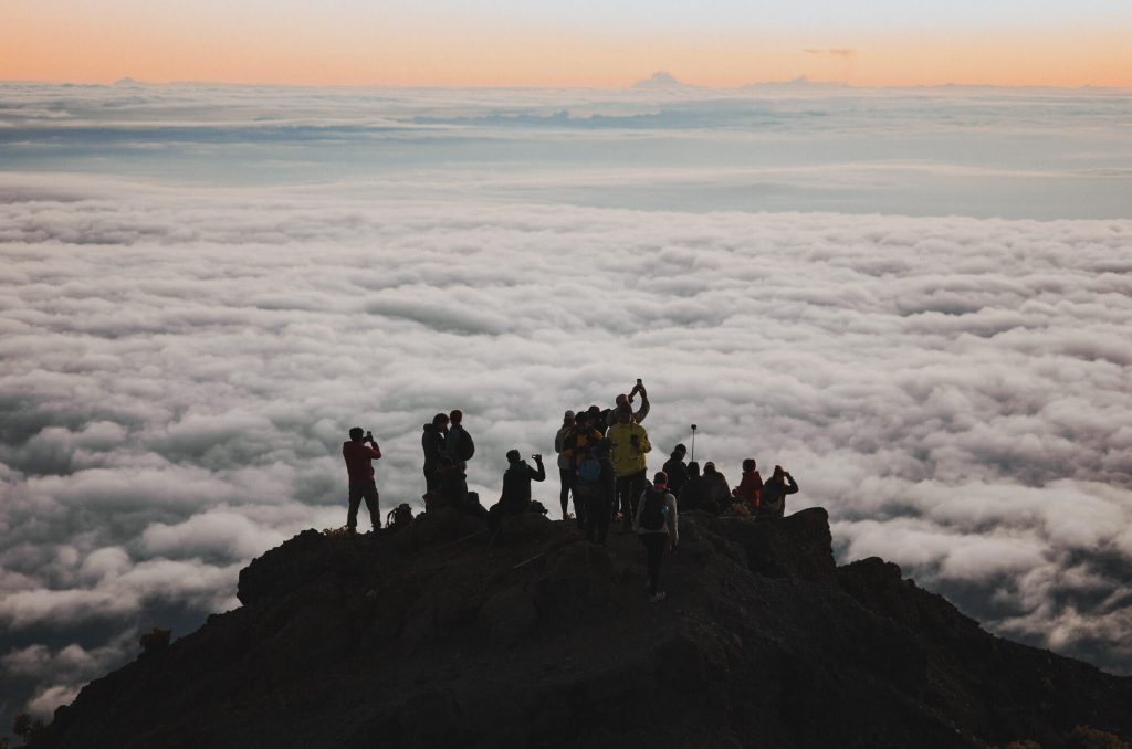 攻頂這天天氣很特別,爬升的過程天空是乾淨的,能看到遠方小鎮的燈火,然而到山頂日出後漸漸形成了雲海,我從沒看過如此廣闊綿密的雲海,在晨光的照耀之下,一切又顯得更魔幻了。雖然我們的嚮導Edi說,這不是天氣最好的模樣,天氣好的時候周邊都不會有雲,可以很清晰地看到四周的樣貌,但我反而更喜歡眼前看到的景象,一種更遺世獨立的感覺。