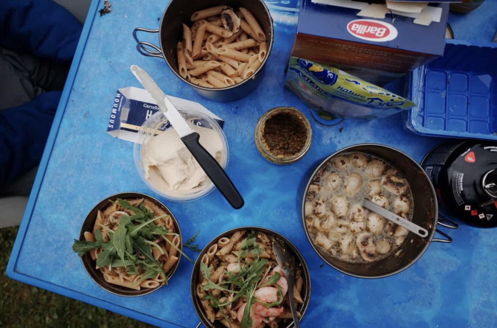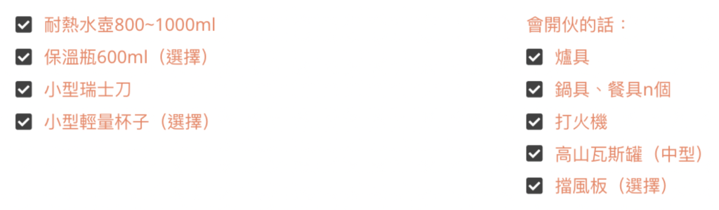 如果有打算開伙,就必須帶上鍋具及爐⼦和瓦斯,食材的話幾乎每到⼀個住宿點附近都會有超市可以購買(唯⼀的例外是你那天計劃住在山上的山屋),瓦斯罐的補給也很容易,因此⼀次帶⼀罐上山就好。