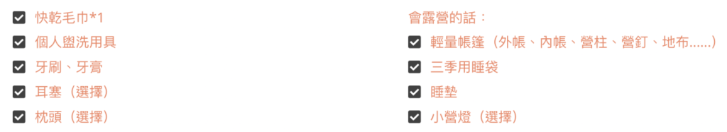 你可以選擇全程住山屋、旅館,那你就可以不⽤帶任何過夜裝備。⼀旦決定要露營,你就必須帶上帳篷、睡袋和睡墊,也建議可以帶個輕量枕頭讓你⼀夜好眠。