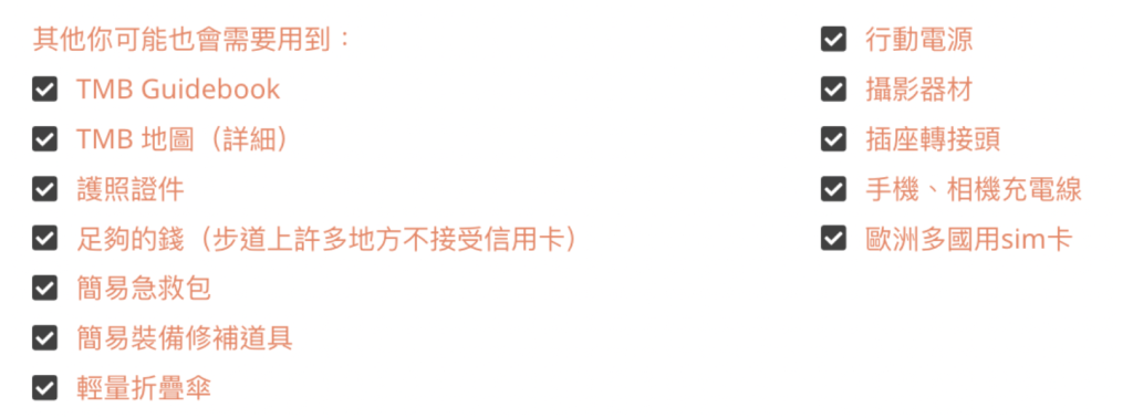 根據我們在網路上看到的其他Hiker的經驗,在⾛TMB時,背包總重(含背包本身)不要超過11公⽄,而且越輕越好!